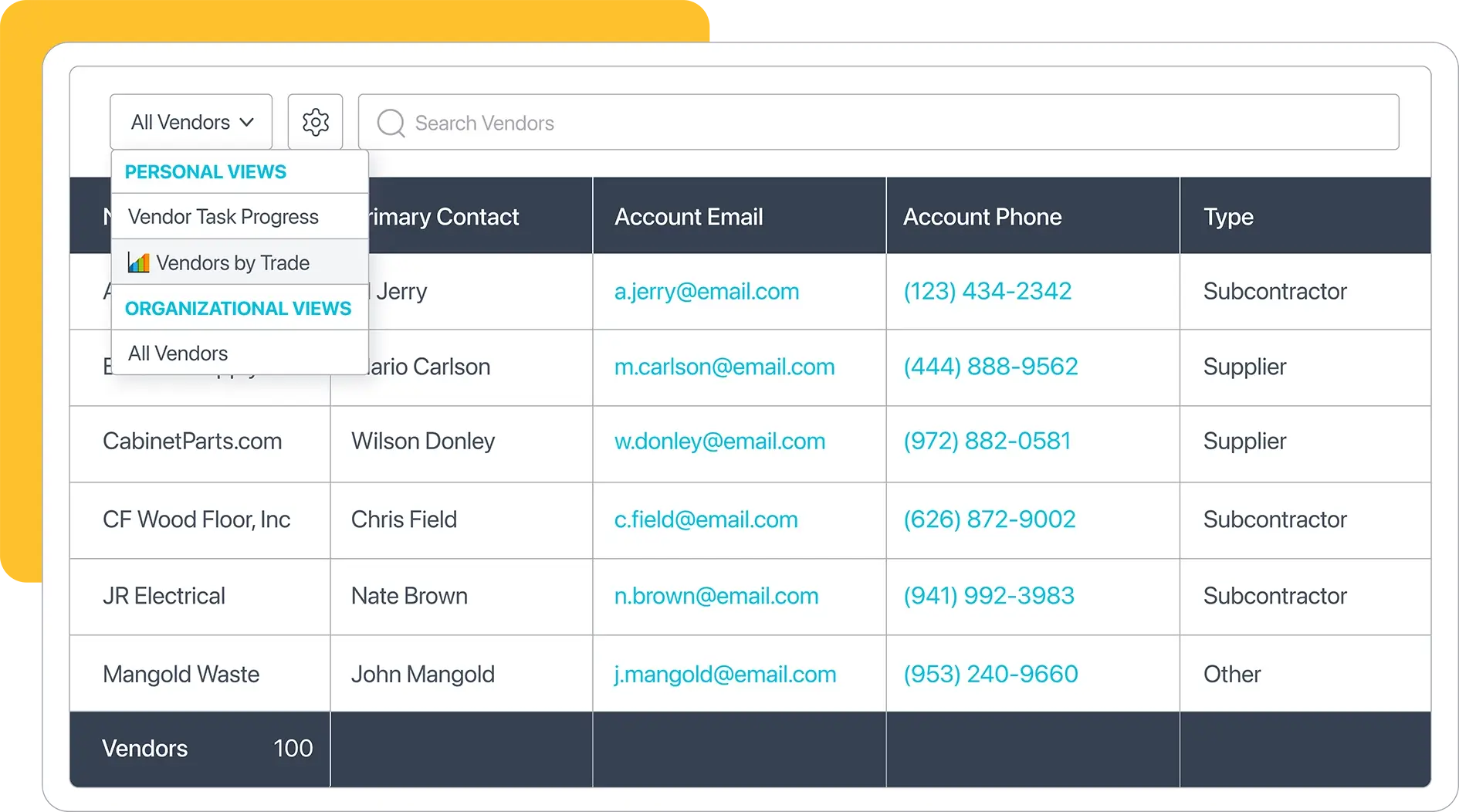 Organize contacts by trade and store W‑9s, COIs, and key documents in one place.